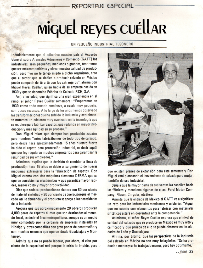 “A LO LARGO DE LOS AÑOS HEMOS OBSERVADO LA TRANSFORMACION QUE HA SUFRIDO LA INDUSTRIA Y ACTUALMENTE NOTAMOS UN ADELANTO MUY AVANZADO EN LA TECNOLOGIA QUE SE REQUIERE PARA FABRICAR ZAPATOS, QUE REDUNDA EN UNA MAYOR PRODUCCION Y MAYOR AGILIDAD EN SU PROCESO.” Entrevista realizada a Miguel Reyes Cuellar por mundo ejecutivo en agosto de 1986 VOL.XV Num. 88